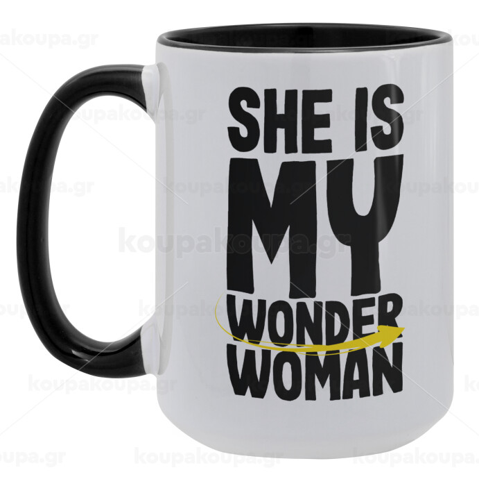 She is my wonder woman, Κούπα Mega 15oz, κεραμική Μαύρη, 450ml