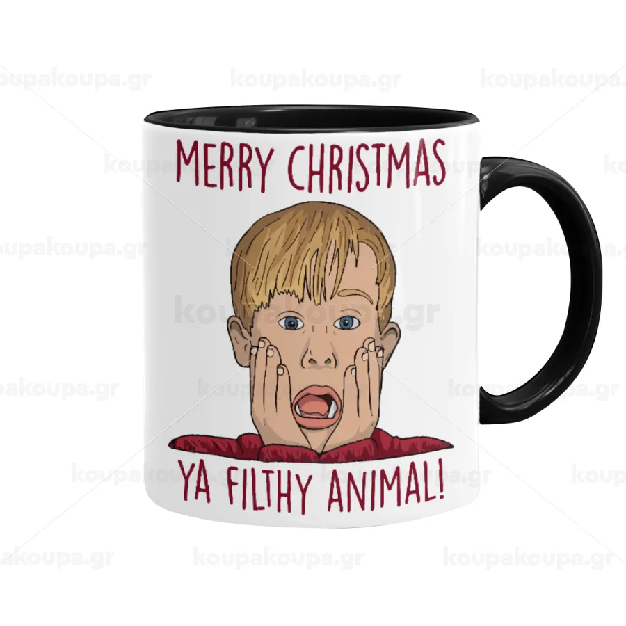 home alone, Merry Christmas ya filthy animal, Κούπα χρωματιστή μαύρη, κεραμική, 330ml