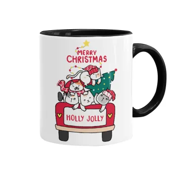 Merry Christmas cats in car, Κούπα χρωματιστή μαύρη, κεραμική, 330ml