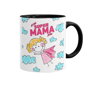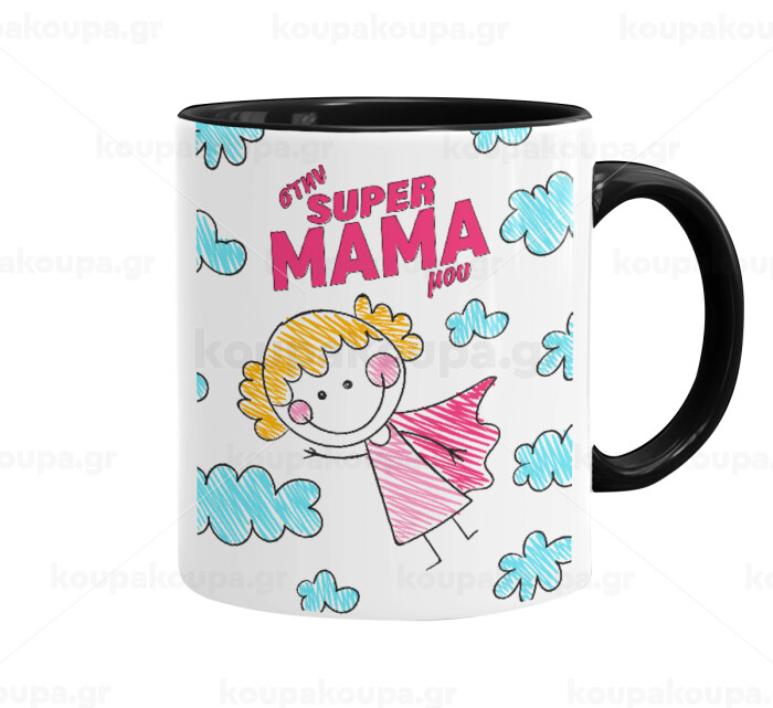 Στην SUPER μαμά μου, comic, Κούπα χρωματιστή μαύρη, κεραμική, 330ml
