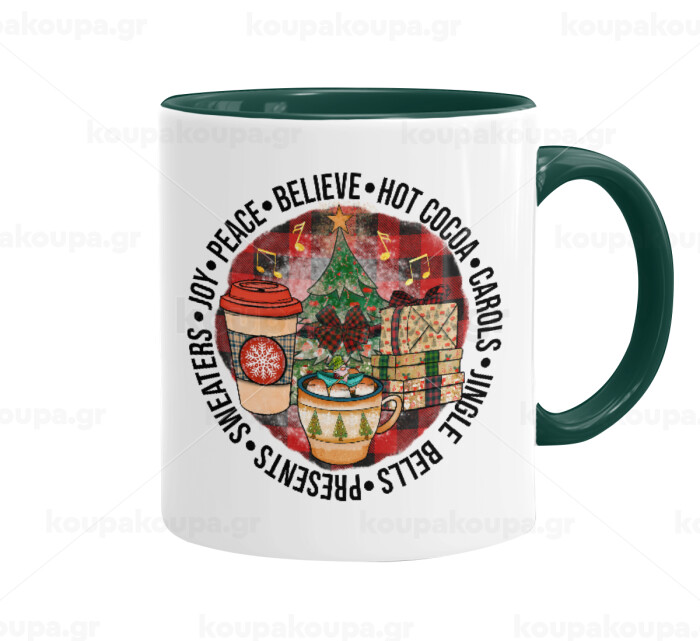 Joy, Peace, Believe, Hot Cocoa, Carols, Κούπα χρωματιστή πράσινη, κεραμική, 330ml