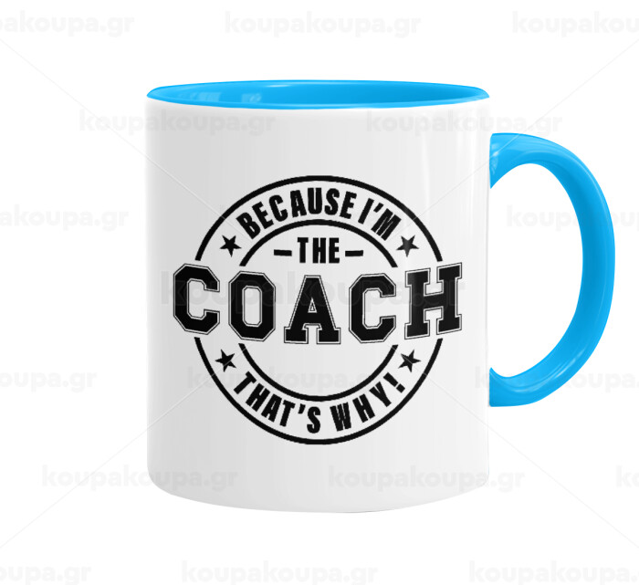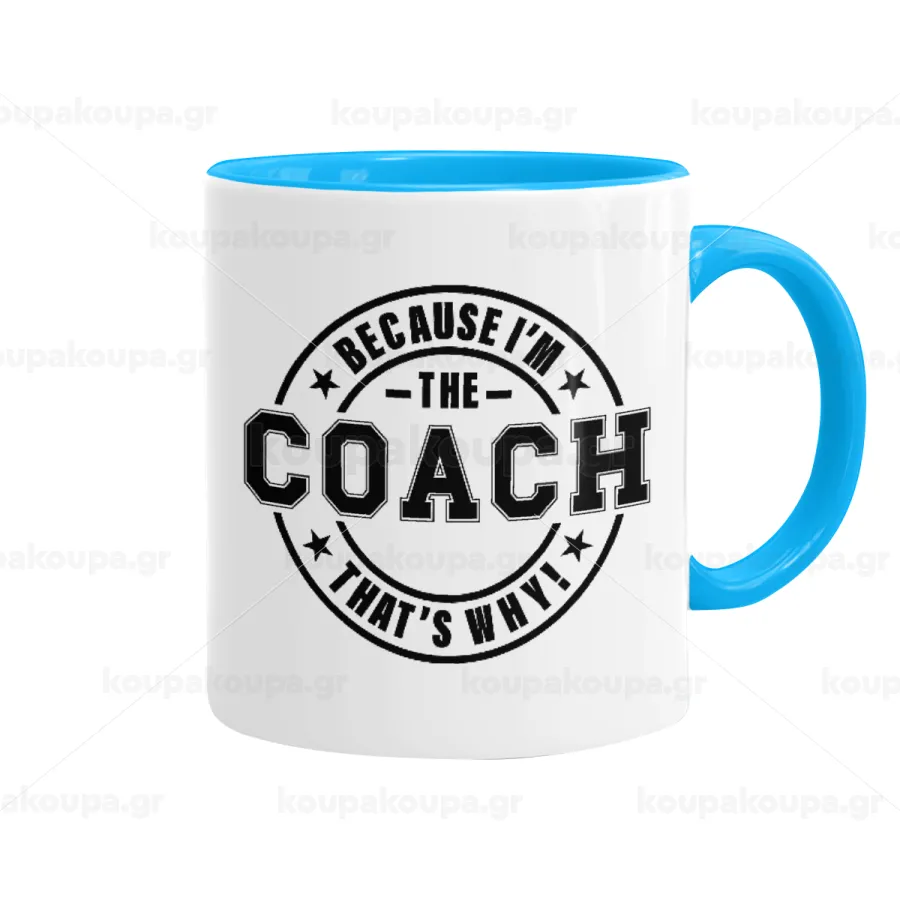 Because i'm the Coach, Κούπα χρωματιστή γαλάζια, κεραμική, 330ml