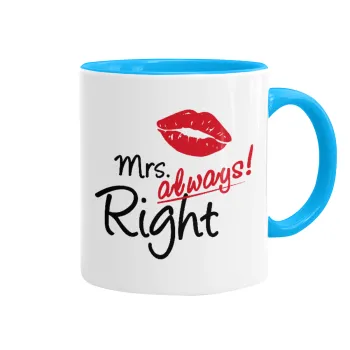 Mrs always right kiss, Κούπα χρωματιστή γαλάζια, κεραμική, 330ml