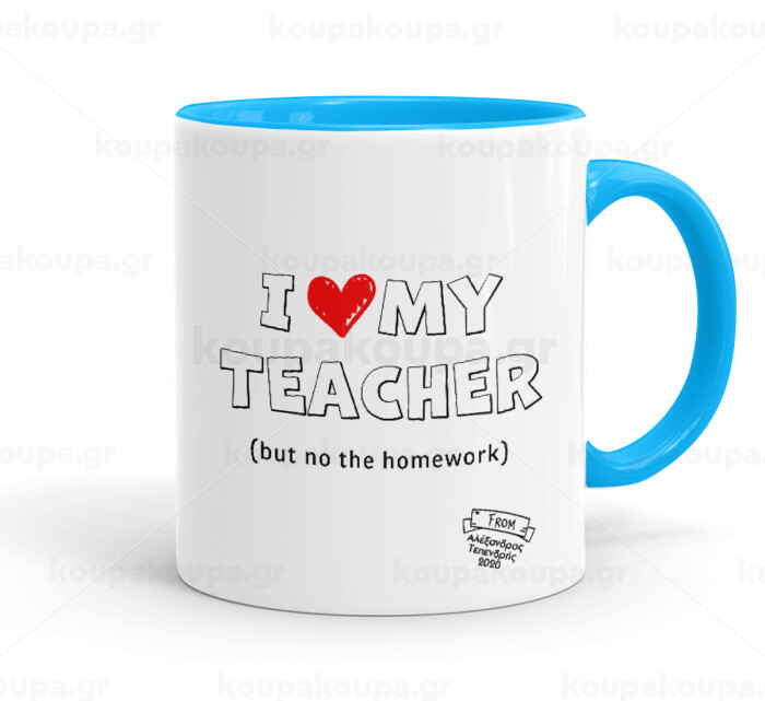 i love my teacher but no the homework outline, Κούπα χρωματιστή γαλάζια, κεραμική, 330ml