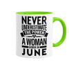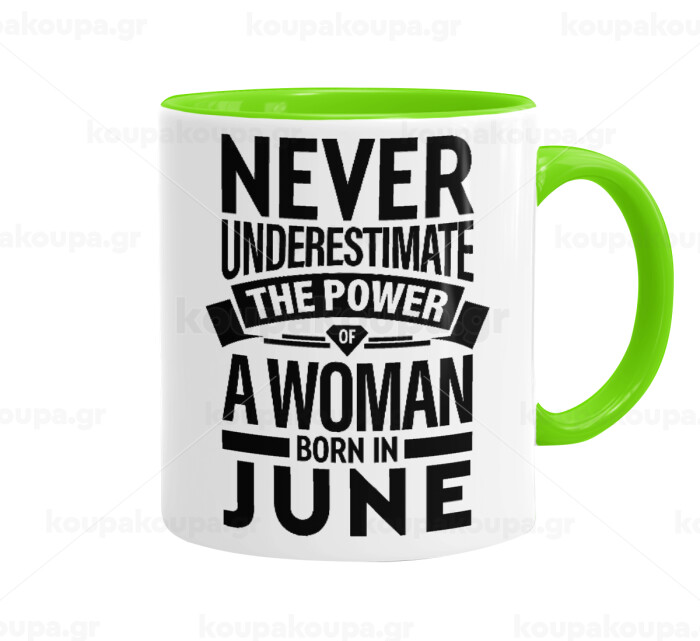 Never Underestimate the poer of a Woman born in..., Κούπα χρωματιστή βεραμάν, κεραμική, 330ml