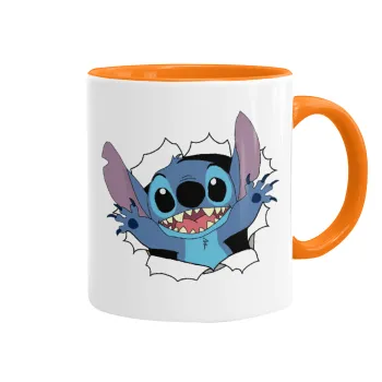 Stitch hello!!!, Κούπα χρωματιστή πορτοκαλί, κεραμική, 330ml