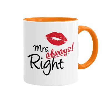 Mrs always right kiss, Κούπα χρωματιστή πορτοκαλί, κεραμική, 330ml