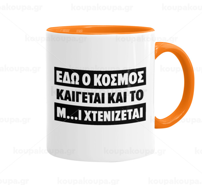 Εδώ ο κόσμος καίγεται και το Μ....Ι χτενίζεται, Κούπα χρωματιστή πορτοκαλί, κεραμική, 330ml
