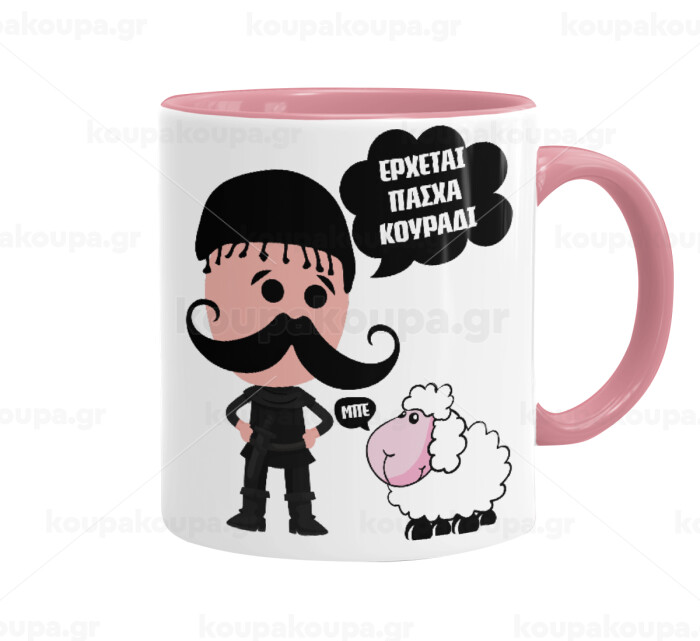 Κρητικός "Έρχεται Πάσχα κουράδι", Κούπα χρωματιστή ροζ, κεραμική, 330ml