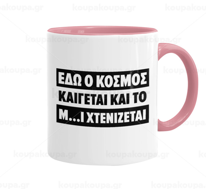 Εδώ ο κόσμος καίγεται και το Μ....Ι χτενίζεται, Κούπα χρωματιστή ροζ, κεραμική, 330ml
