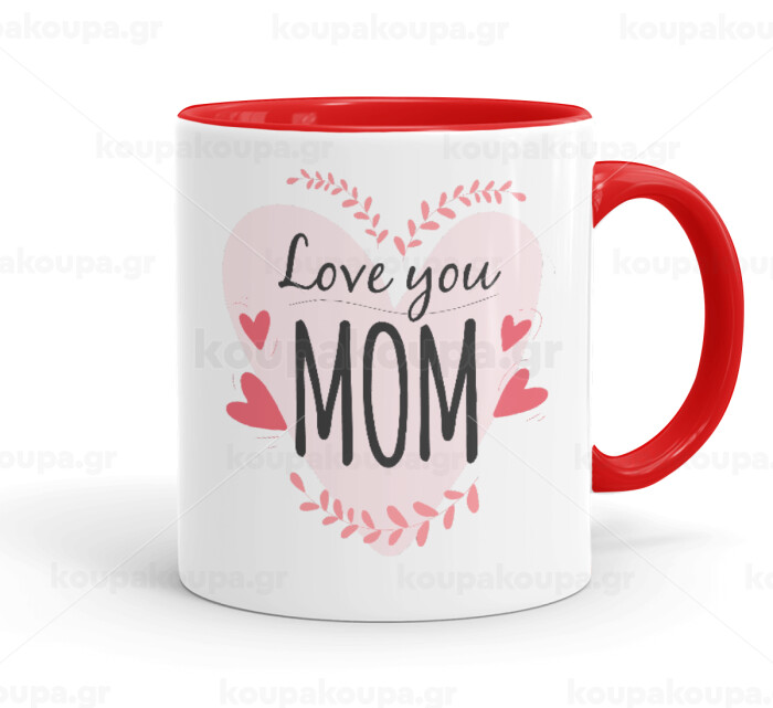 Mother's day I Love you Mom heart, Κούπα χρωματιστή κόκκινη, κεραμική, 330ml