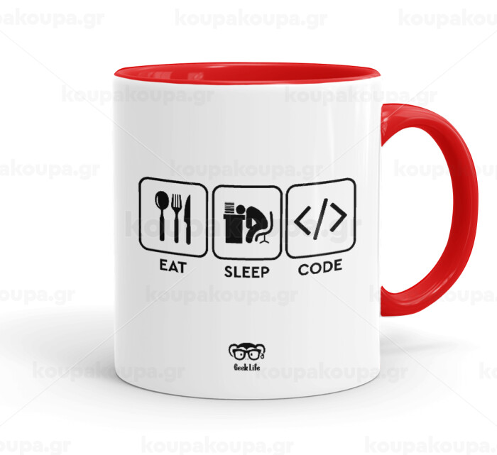 Eat Sleep Code, Κούπα χρωματιστή κόκκινη, κεραμική, 330ml