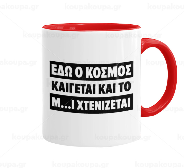 Εδώ ο κόσμος καίγεται και το Μ....Ι χτενίζεται, Κούπα χρωματιστή κόκκινη, κεραμική, 330ml