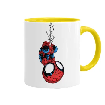 Spiderman upside down, Κούπα χρωματιστή κίτρινη, κεραμική, 330ml