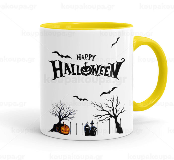 Happy Halloween cemetery, Κούπα χρωματιστή κίτρινη, κεραμική, 330ml