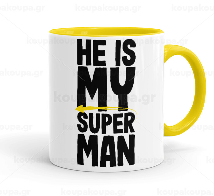 He is my superman, Κούπα χρωματιστή κίτρινη, κεραμική, 330ml