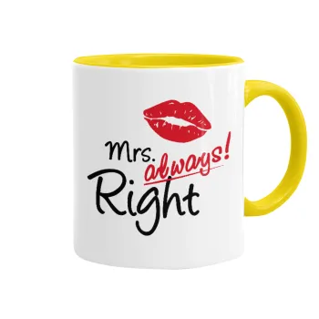 Mrs always right kiss, Κούπα χρωματιστή κίτρινη, κεραμική, 330ml