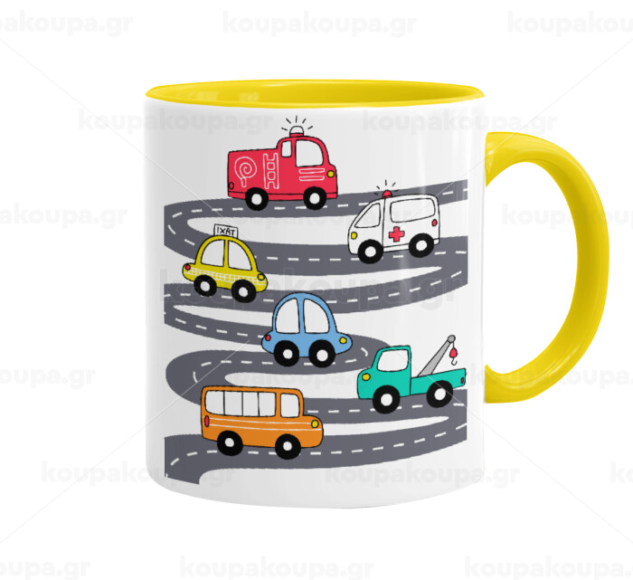 Hand drawn childish set with cars, Κούπα χρωματιστή κίτρινη, κεραμική, 330ml