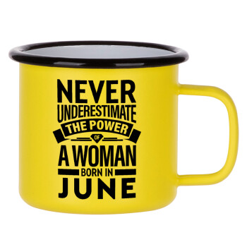 Never Underestimate the poer of a Woman born in..., Κούπα Μεταλλική εμαγιέ ΜΑΤ Κίτρινη 360ml