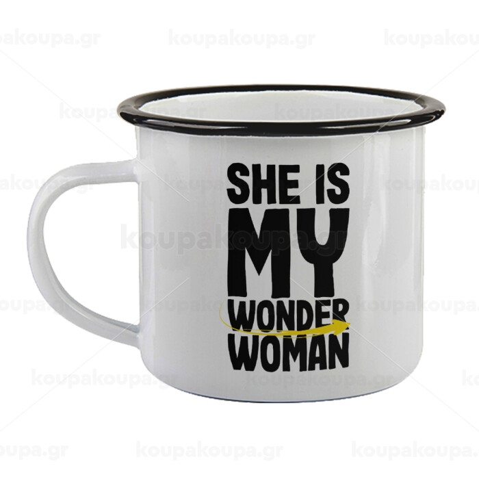 She is my wonder woman, Κούπα εμαγιέ με μαύρο χείλος 360ml