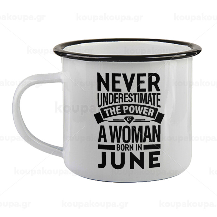 Never Underestimate the poer of a Woman born in..., Κούπα εμαγιέ με μαύρο χείλος 360ml