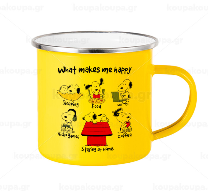 Snoopy what makes my happy, Κούπα Μεταλλική εμαγιέ Κίτρινη 360ml