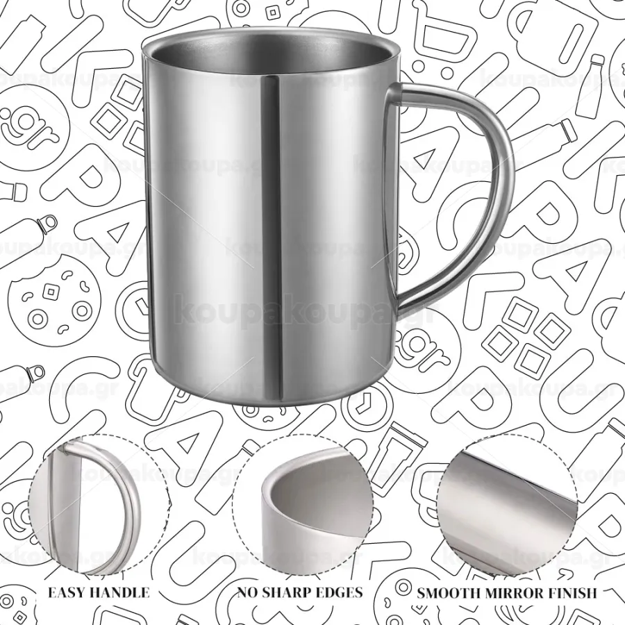 Ανακαλύψτε τις υψηλής ποιότητας μεταλλικές κούπες 450ml, κατασκευασμένες από ανοξείδωτο ατσάλι. Διατίθενται σε δύο εκδόσεις: καθαρό μεταλλικό φινίρισμα και λευκή εξωτερική επίστρωση για εκτύπωση σχεδίων. Χάρη στη διπλή τοιχώματη κατασκευή τους, διατηρούν το ρόφημά σας ζεστό για περισσότερη ώρα και ταυτόχρονα προστατεύουν τα χέρια σας από τη θερμότητα. (Προτεινόμενο πλύσιμο στο χέρι)