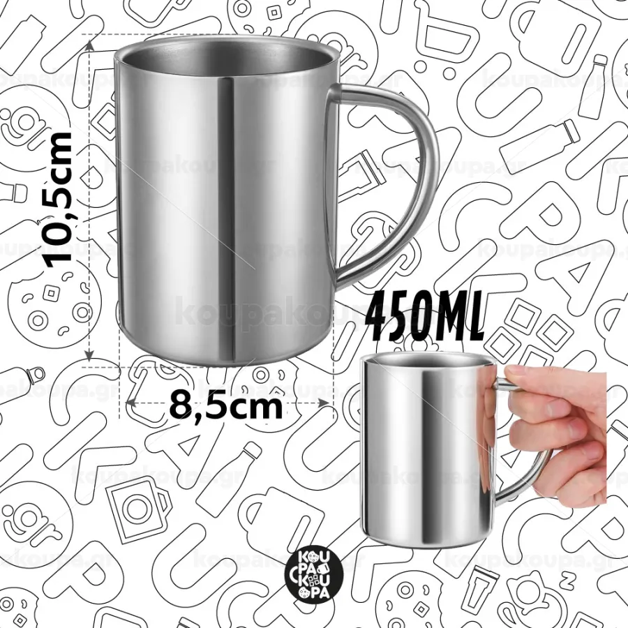 Ανακαλύψτε τις υψηλής ποιότητας μεταλλικές κούπες 450ml, κατασκευασμένες από ανοξείδωτο ατσάλι. Διατίθενται σε δύο εκδόσεις: καθαρό μεταλλικό φινίρισμα και λευκή εξωτερική επίστρωση για εκτύπωση σχεδίων. Χάρη στη διπλή τοιχώματη κατασκευή τους, διατηρούν το ρόφημά σας ζεστό για περισσότερη ώρα και ταυτόχρονα προστατεύουν τα χέρια σας από τη θερμότητα. (Προτεινόμενο πλύσιμο στο χέρι)