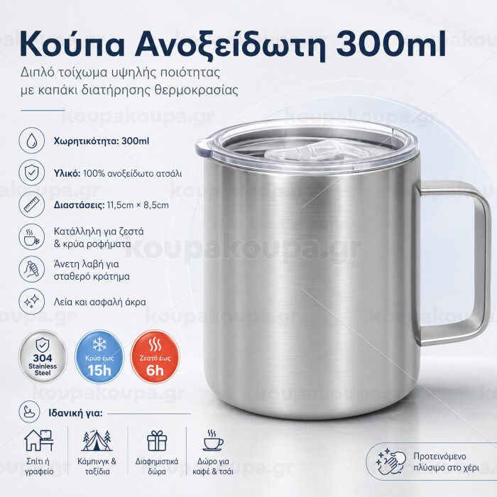 Κούπα ανοξείδωτη (300ml) με διπλό τοίχωμα εξαιρετικής ποιότητας και καπάκι διατήρησης θερμοκρασίας. Κατάλληλη για ζεστά και κρύα ροφήματα. Το διπλό τοίχωμα κρατάει την θερμοκρασία του ροφήματος εσωτερικά και επιτρέπει να αγκαλιάζετε το ρόφημα σας.