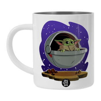 Baby Yoda mandalorian, Λευκή Ανοξείδωτη Μεταλλική Κούπα 450ml - Διπλού Τοιχώματος