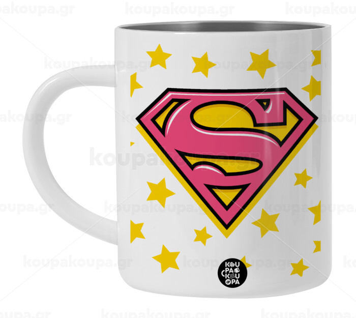 Superman Pink, Λευκή Ανοξείδωτη Μεταλλική Κούπα 450ml - Διπλού Τοιχώματος