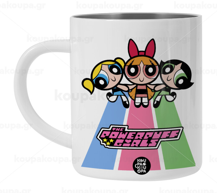 The powerpuff girls , Λευκή Ανοξείδωτη Μεταλλική Κούπα 450ml - Διπλού Τοιχώματος