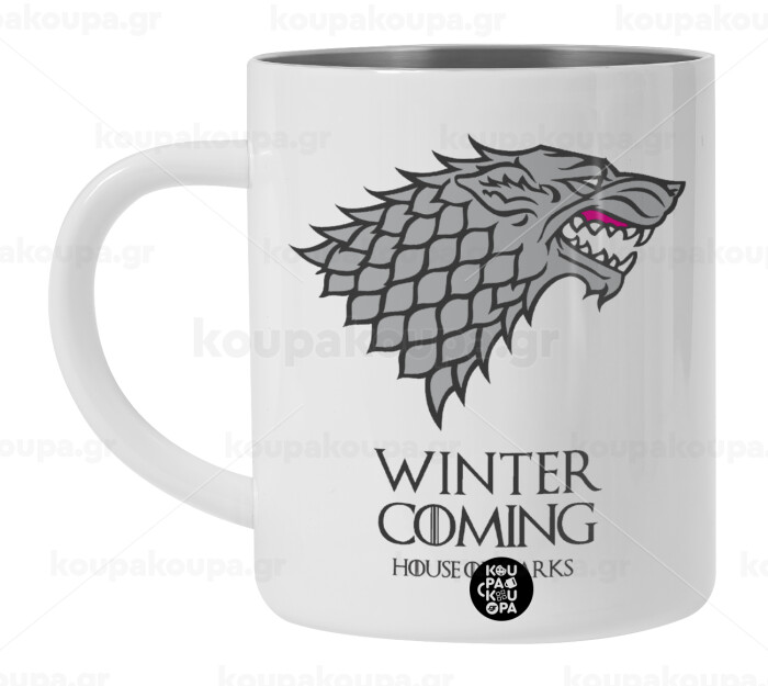 GOT House of Starks, winter coming, Λευκή Ανοξείδωτη Μεταλλική Κούπα 450ml - Διπλού Τοιχώματος