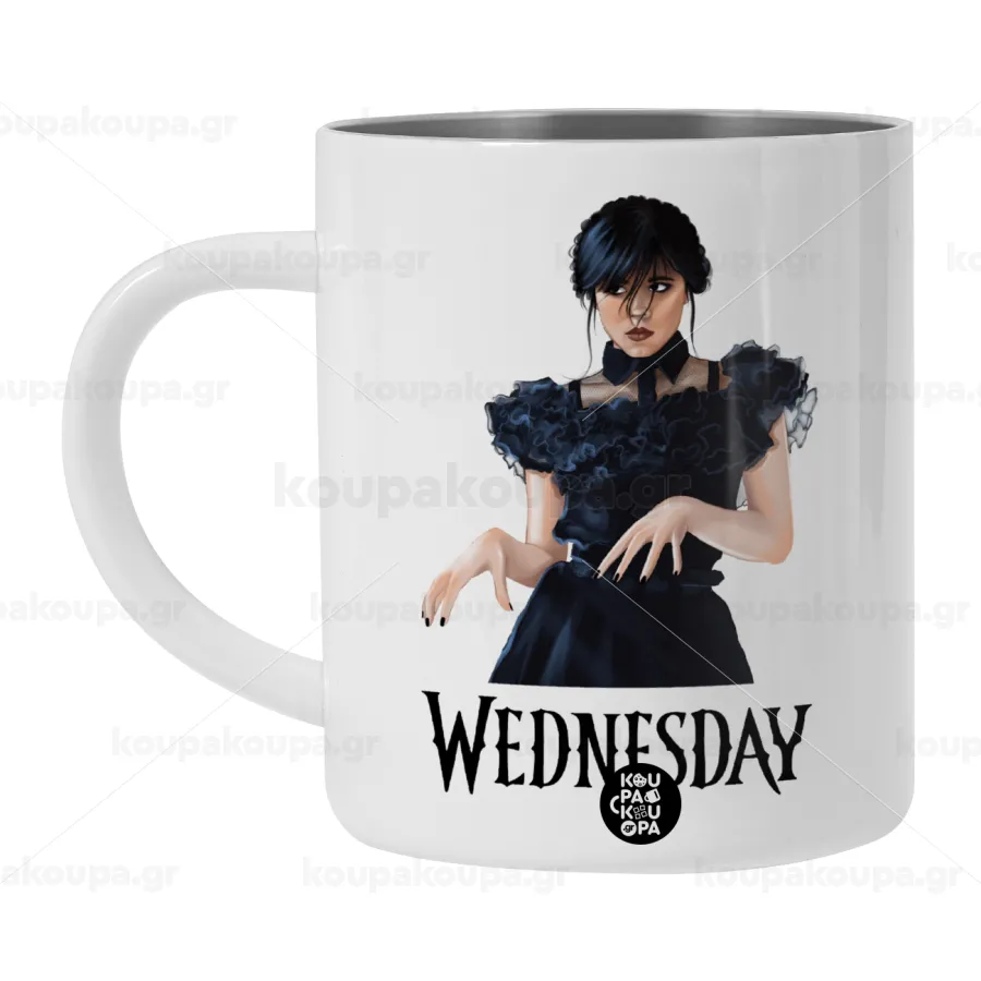 Wednesday Adams, dance with hands, Λευκή Ανοξείδωτη Μεταλλική Κούπα 450ml - Διπλού Τοιχώματος