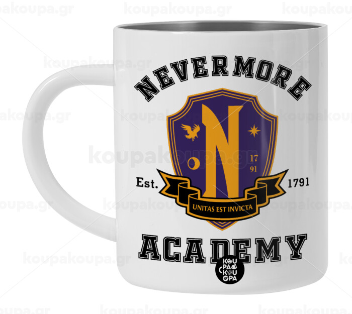 Wednesday Nevermore Academy University, Λευκή Ανοξείδωτη Μεταλλική Κούπα 450ml - Διπλού Τοιχώματος