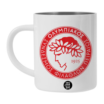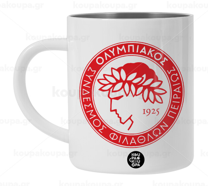 Ολυμπιακός, Λευκή Ανοξείδωτη Μεταλλική Κούπα 450ml - Διπλού Τοιχώματος
