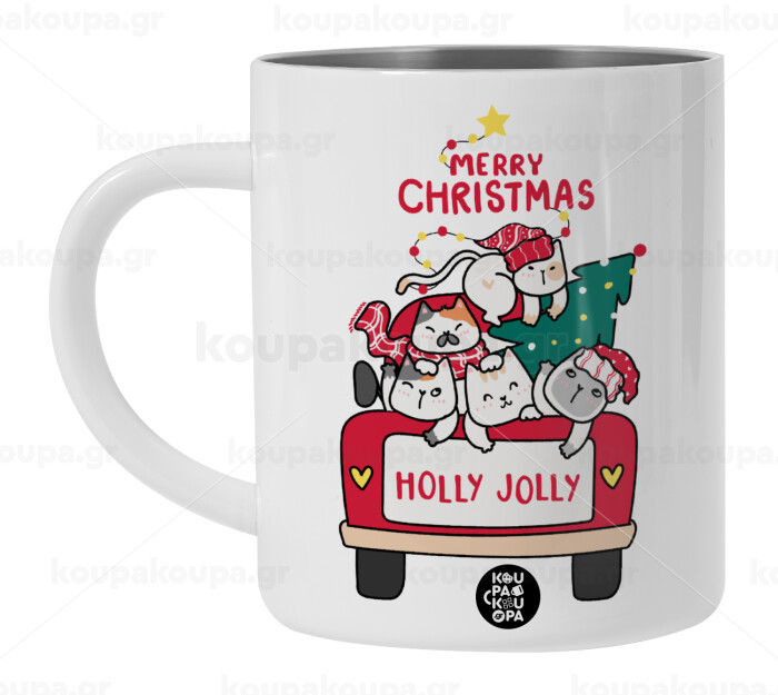 Merry Christmas cats in car, Λευκή Ανοξείδωτη Μεταλλική Κούπα 450ml - Διπλού Τοιχώματος