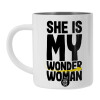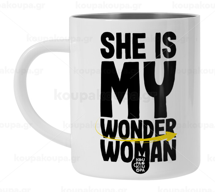 She is my wonder woman, Λευκή Ανοξείδωτη Μεταλλική Κούπα 450ml - Διπλού Τοιχώματος