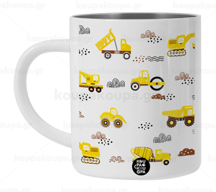 Αμαξάκια φορτωτές και μπουλντόζες, Λευκή Ανοξείδωτη Μεταλλική Κούπα 450ml - Διπλού Τοιχώματος