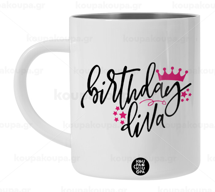 Birthday Diva queen, Λευκή Ανοξείδωτη Μεταλλική Κούπα 450ml - Διπλού Τοιχώματος