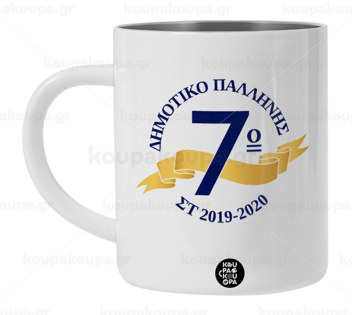 Σχολική μπλε με κορδέλα, Λευκή Ανοξείδωτη Μεταλλική Κούπα 450ml - Διπλού Τοιχώματος