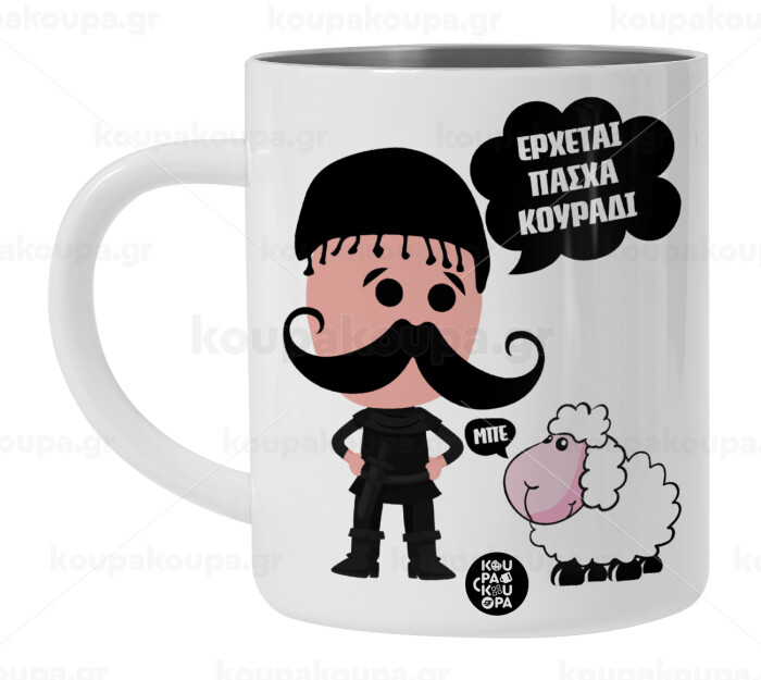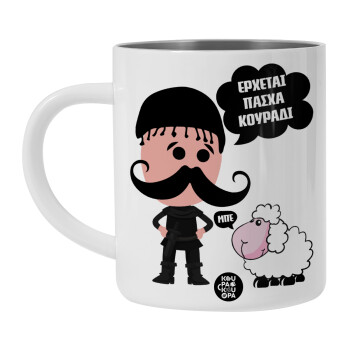 Κρητικός "Έρχεται Πάσχα κουράδι", Λευκή Ανοξείδωτη Μεταλλική Κούπα 450ml - Διπλού Τοιχώματος