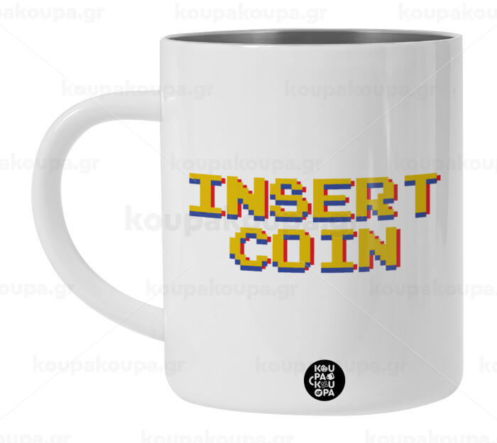 Insert coin!!!, Λευκή Ανοξείδωτη Μεταλλική Κούπα 450ml - Διπλού Τοιχώματος