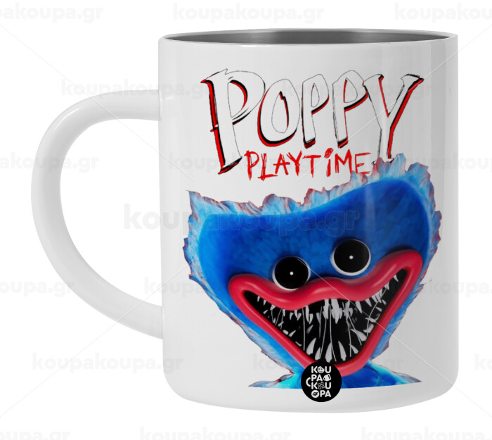Poppy Playtime Huggy wuggy, Λευκή Ανοξείδωτη Μεταλλική Κούπα 450ml - Διπλού Τοιχώματος