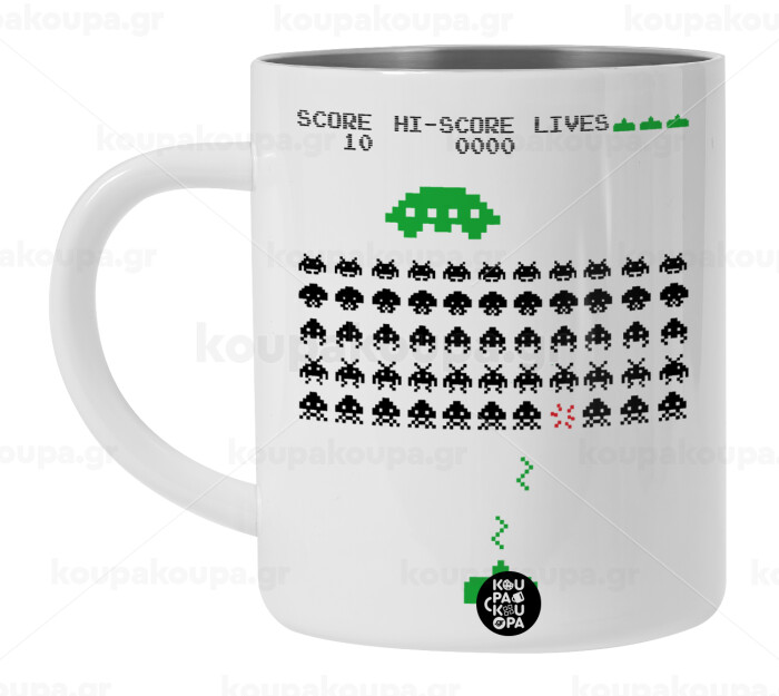 Space invaders, Λευκή Ανοξείδωτη Μεταλλική Κούπα 450ml - Διπλού Τοιχώματος