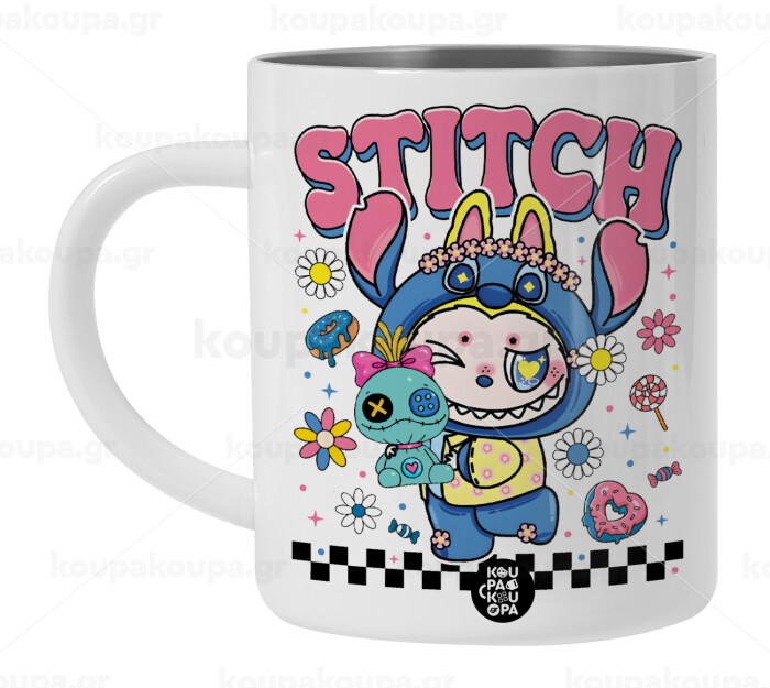 Labubu Stitch, Λευκή Ανοξείδωτη Μεταλλική Κούπα 450ml - Διπλού Τοιχώματος