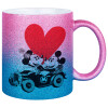 Mickey & Minnie love car, Κούπα Χρυσή/Μπλε Glitter, κεραμική, 330ml
