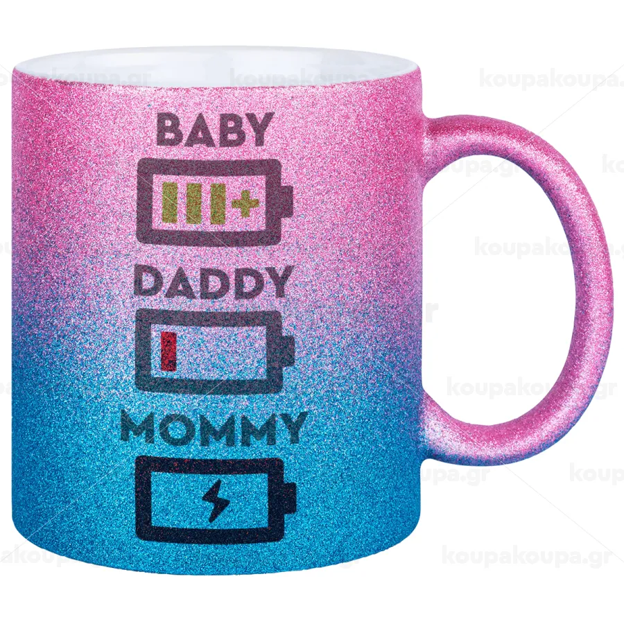 BABY, MOMMY, DADDY Low battery, Κούπα Χρυσή/Μπλε Glitter, κεραμική, 330ml