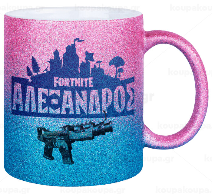 Fortnite with gun με το όνομα σου, Κούπα Χρυσή/Μπλε Glitter, κεραμική, 330ml