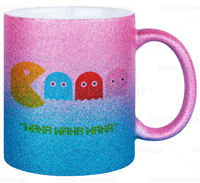 Pacman waka waka waka, Κούπα Χρυσή/Μπλε Glitter, κεραμική, 330ml
